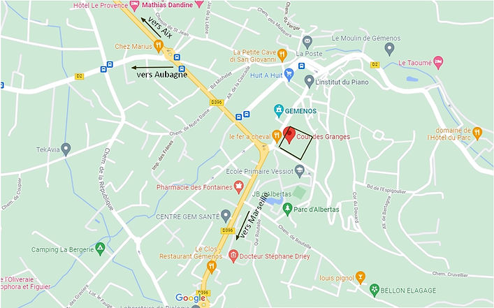 Par l’autoroute A52 depuis Aix-Nice - sortie 35 Aubagne-Est (CC Auchan), puis tourner à gauche direction Gémenos. ensuite tout droit D2, jusqu’au village. Au grand Rd Pt de l’entrée du village, aller en face Av Vessiot et le parking de la Cour des Granges.